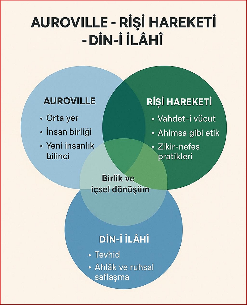 Bu üç girişim —Rişi hareketi, Din-i İlâhî ve Auroville— görünüşte farklı olsa da aynı nehirden beslenir.